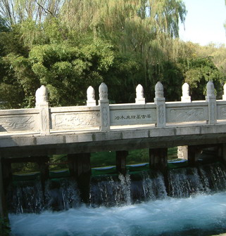 水至清则无鱼,可明明有红色的鲤鱼在水里自在地游曳,追逐嬉戏着珍珠气泡。碧潭之水常年恒温18℃,霜降以后,气温走低,水面即水汽升腾,烟雾朦胧。四面竹林幽深围绕,岸边柳条摇摆凝露带霜,造型各异的汉白玉小桥横跨静卧,连接着一处处碧潭景观,别有洞天。四季植被葱葱茏茏水面倒影,如入仙境。